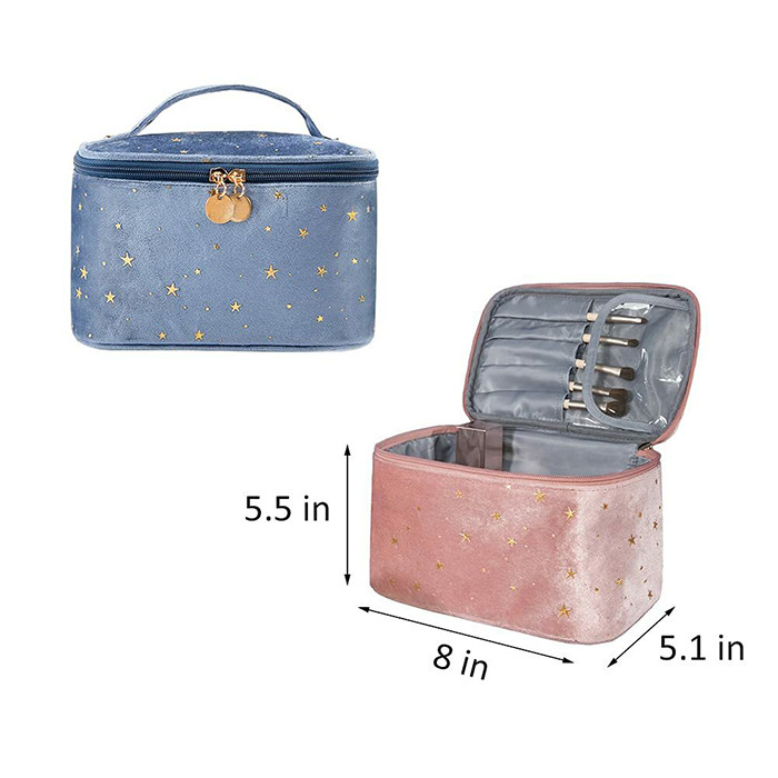 Progettazione perfetta: Doppia chiusura lampo intorno alla fine; Stelle delicate di timbratura di oro su velluto; Il makup separato spazzola il supporto con la copertura di PVC; Il portatile porta la maniglia; Progettazione compatta pieghevole