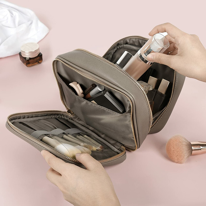 Borsa dell'articolo da toeletta di doppio strato - 2 strati zippered con stanza separeted 4 contribuire a tenere i vostri elementi essenziali differenti di trucco hanno organizzato. Secondo strato con un grande spazio di stoccaggio e una tasca della maglia. Compartimenti multipli per vari bisogni di stoccaggio. Tasca della maglia per la conservazione dei cosmetici piccoli e piani. dia alle vostre spazzole «una casa» sicura & facile asciugare